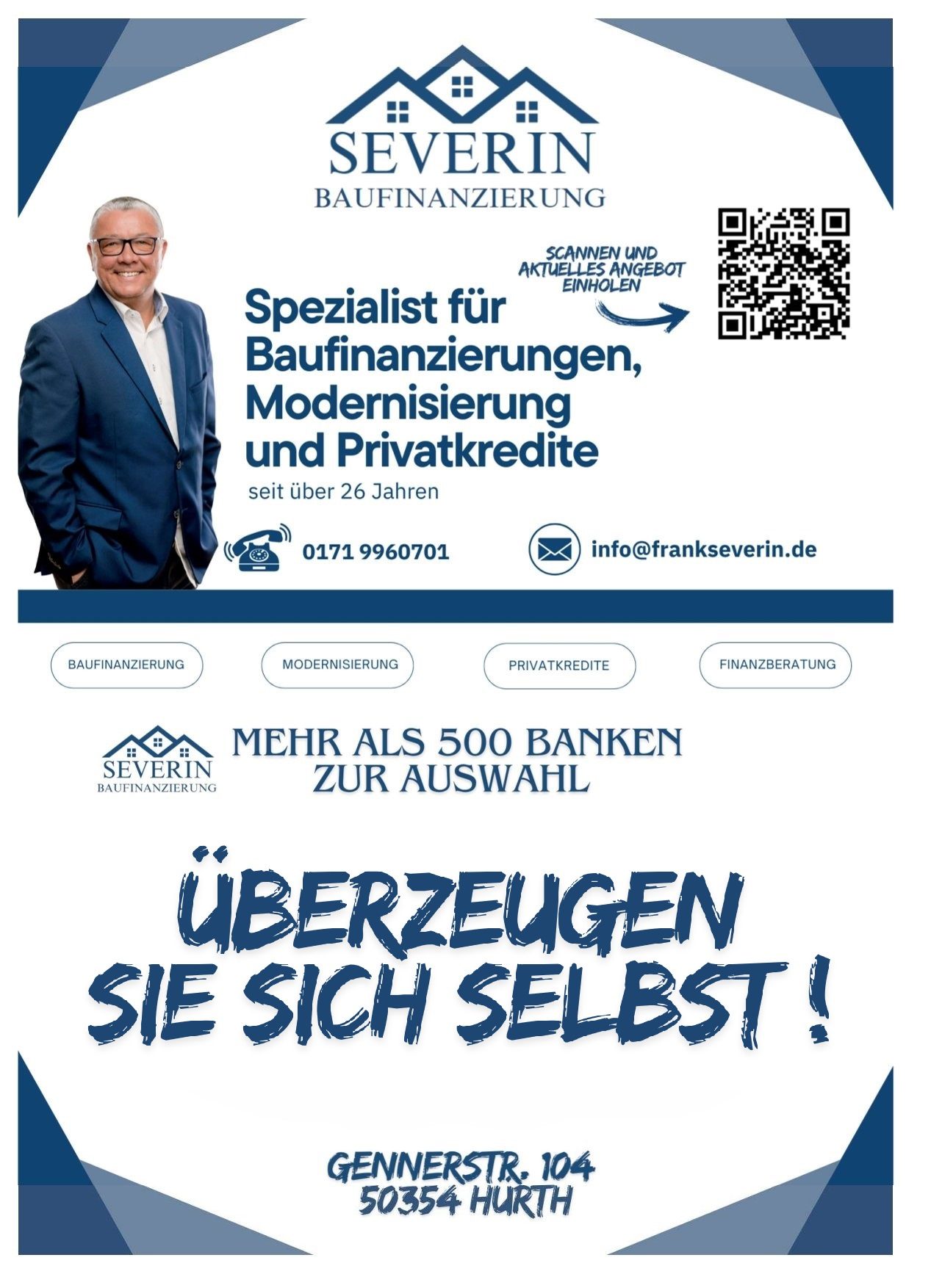 Hallo, mein Name ist Frank Severin – Ihr Baufinanzierungsspezialist seit 26 Jahren! Mit Leidenschaft, Expertise und als erfahrener Berater mit Zugriff auf über 500 Banken finde ich die perfekte Finanzierungslösung für Ihr Traumhaus.